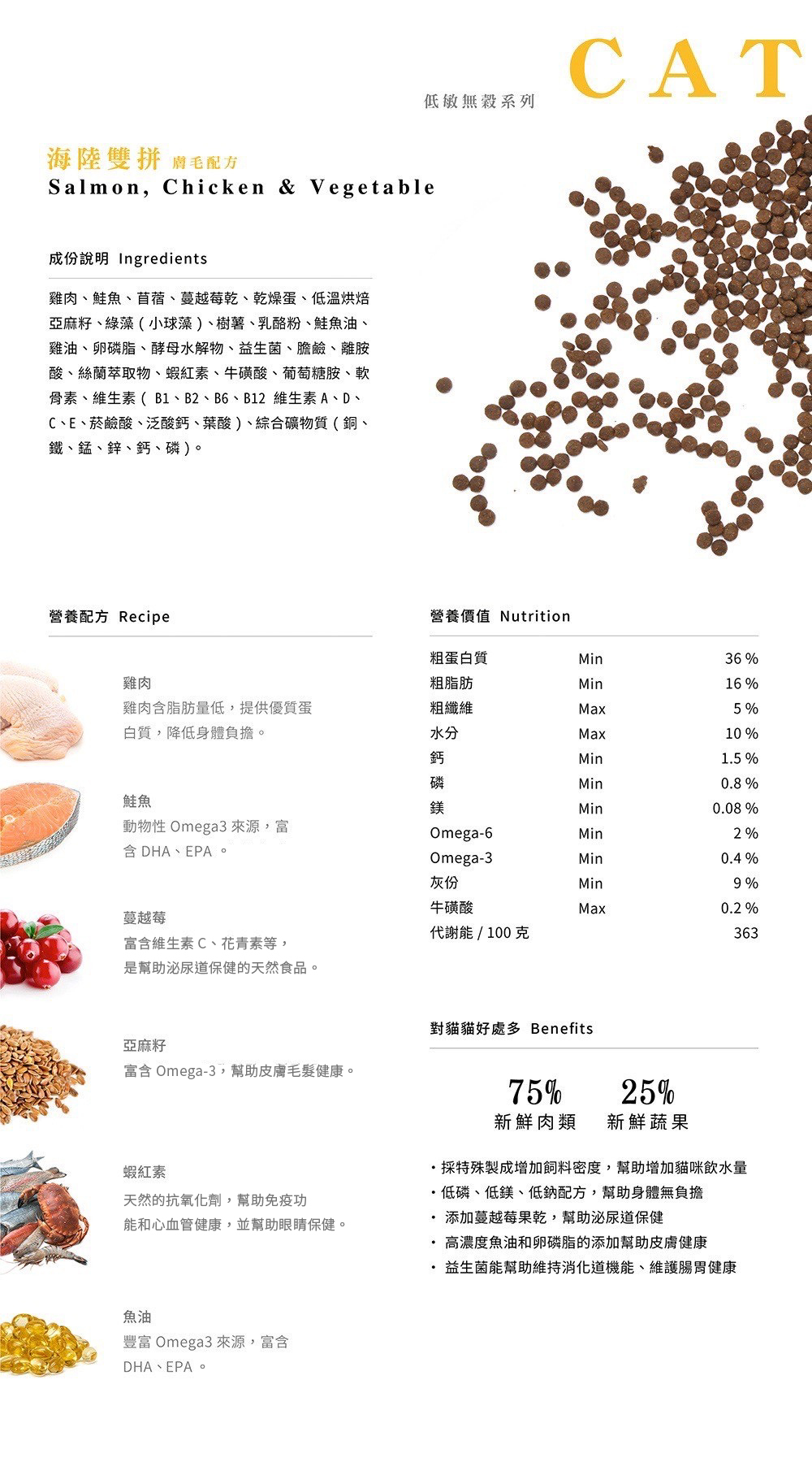 雞肉、鮭魚、苜蓿、蔓越莓乾、乾燥蛋、低溫烘焙亞麻籽、綠藻(小球藻)、樹薯、乳酪粉、鮭魚油、雞油、卵磷脂、酵母水解物、益生菌、膽鹼、離胺酸、絲蘭萃取物、蝦紅素、牛磺酸、葡萄糖胺、軟骨素、維生素( B1、B2、B6、B12 維生素A、D、C、E、菸鹼酸、泛酸鈣、葉酸)、綜合礦物質(銅、鐵、錳、鋅、鈣、磷)。