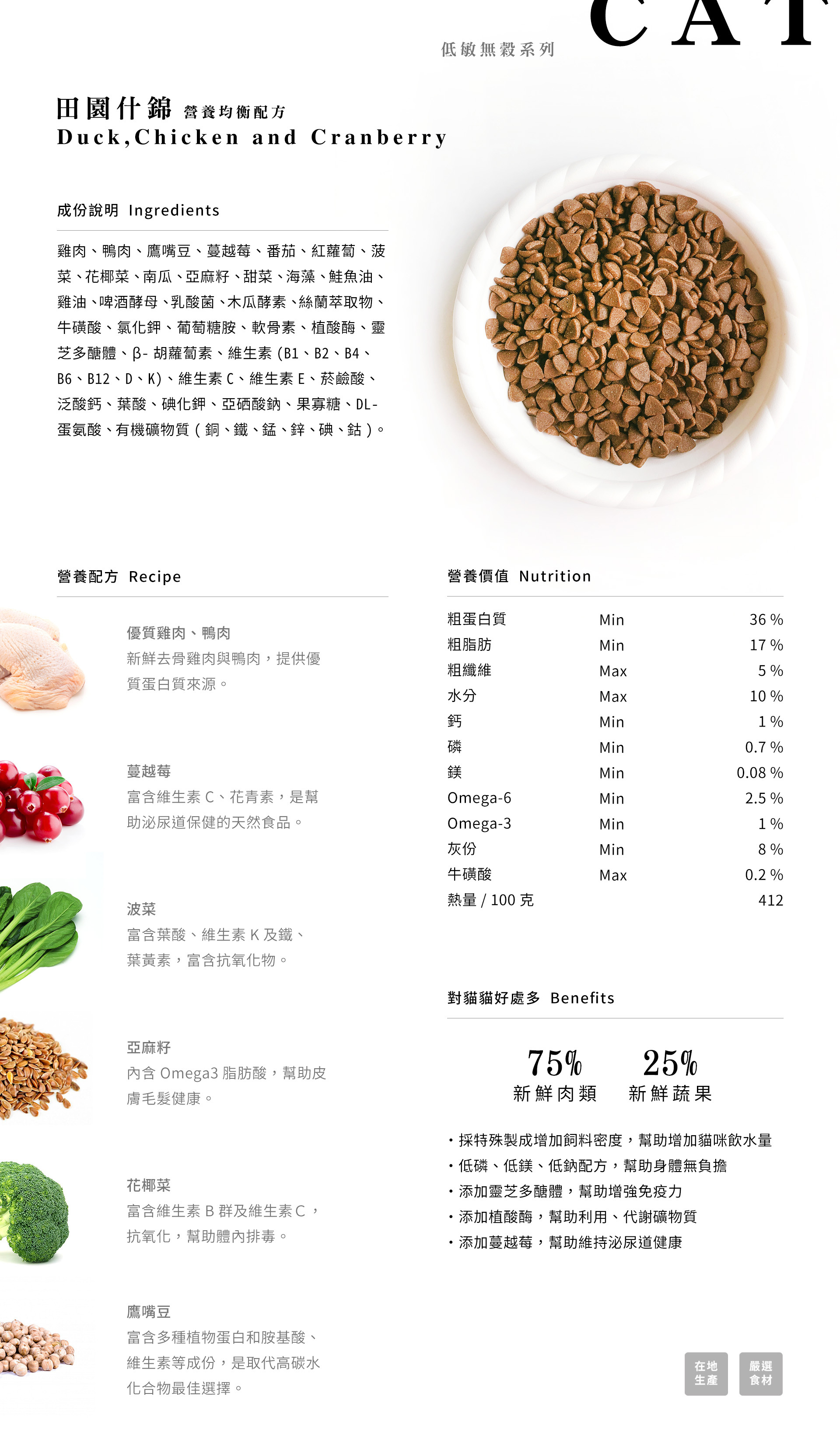 新鮮去骨脫水(雞肉、鴨肉)、鷹嘴豆、蔓越莓、番茄、紅蘿蔔、菠菜、花椰菜、南瓜、亞麻籽、甜菜、海藻、鮭魚油、雞油、啤酒酵母、乳酸菌、木瓜酵素、絲蘭萃取物、牛磺酸、氯化鉀、葡萄糖胺、軟骨素、植酸酶、靈芝多醣體、 β-胡蘿蔔素、維生素(B1、B2、B4、B6、B12、D、K)、維生素C、維生素E、菸鹼酸、泛酸鈣、葉酸、碘化鉀、亞硒酸鈉、果寡糖、DL-蛋氨酸、有機礦物質(銅、鐵、錳、鋅、碘、鈷)。